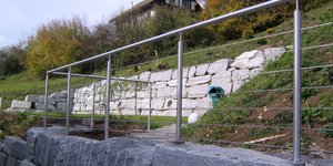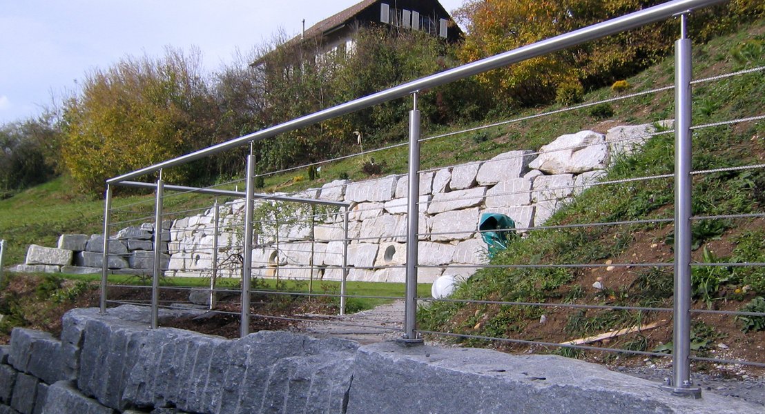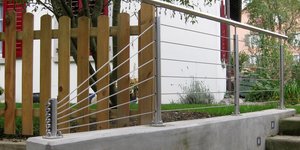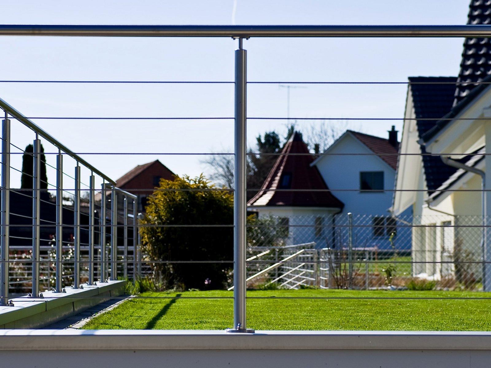Unsere Edelstahlgeländer mit Querstreben oder Stahlseilen eignen sich optimal für Treppen oder Brüstungen mit einer Absturzhöhe von bis zu einem Meter.